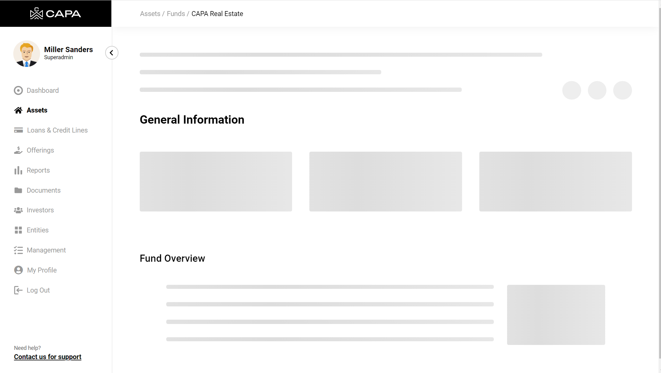 2.- You will see the Funds, Syndications and Properties sections, in the Funds tab you must previously have at least one item created, the Fund card will be displayed, click on the 3 points.