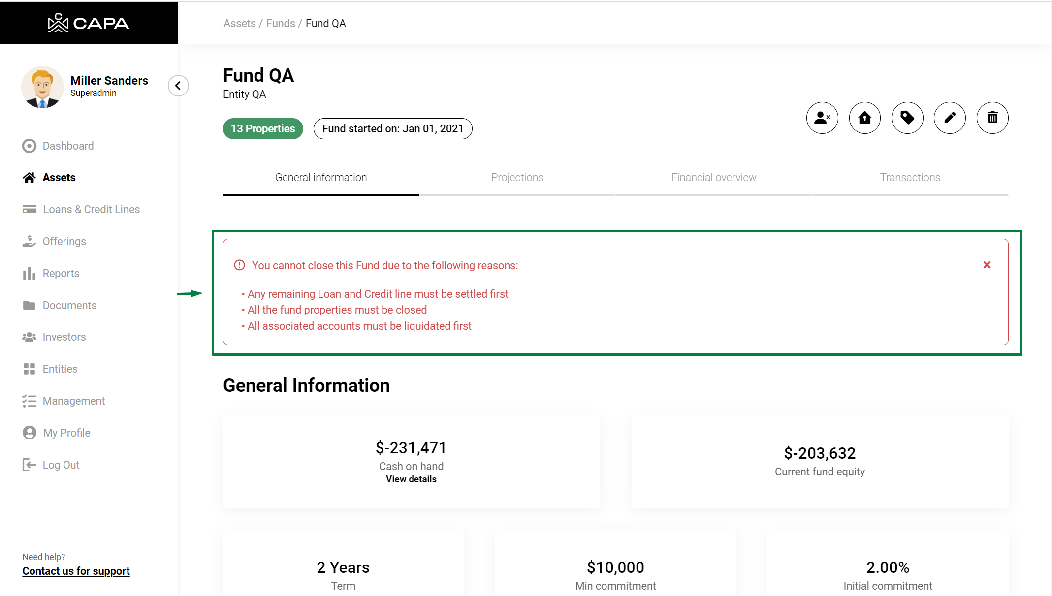 6.- If the preconditions are met, it will allow you to continue and click on the "Close Fund" icon will display the following "Close Fund" modal.